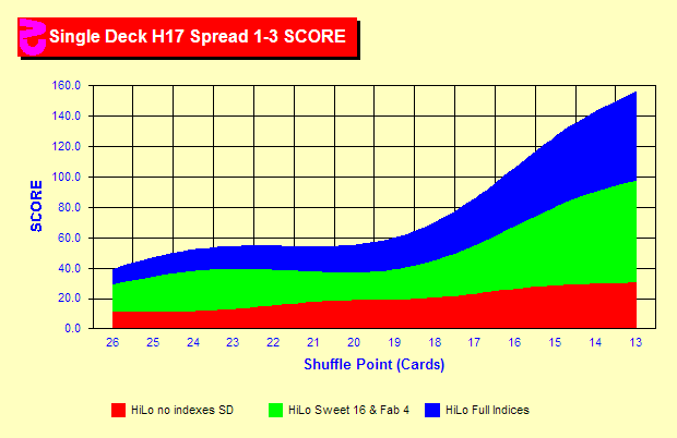 - Single Decks, H17, Heads-Up, Hi-Lo, truncate, quarter-deck resolution,
